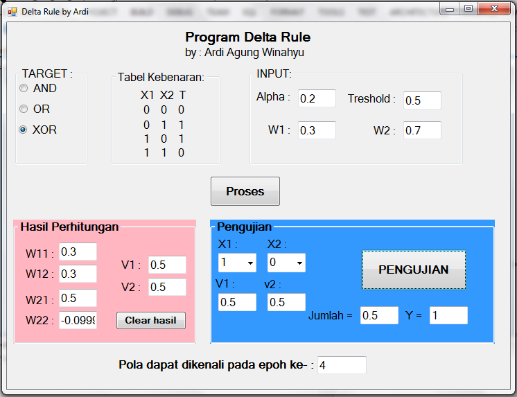 singkat kata, JST adalah sebuah program yang meniru jaringan syaraf manusia untuk mengenali suatu pola. Lebih jelasnya tentang JST, silakan searching sendiri yaa... karena disini sya cuman mau ngeshare contoh programnya aja...